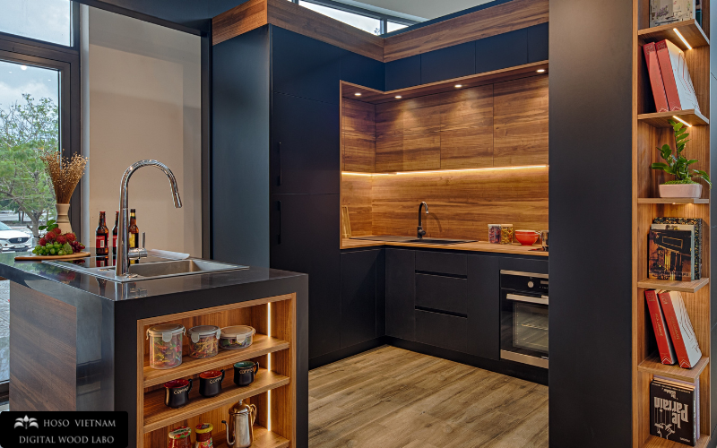 BẾP TRỌN GÓI HOSO | Hệ Tủ Bếp Màu Đen – Vân Gỗ (Noir – Walnut Harmony)