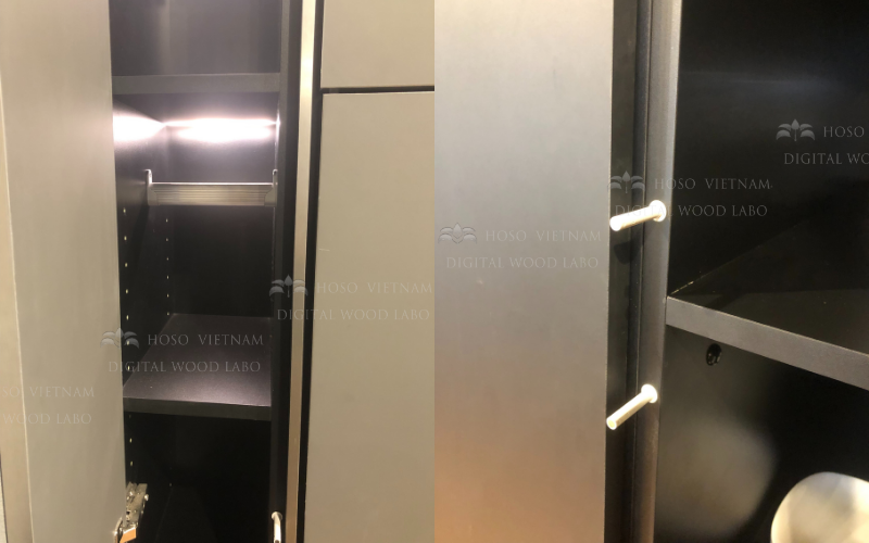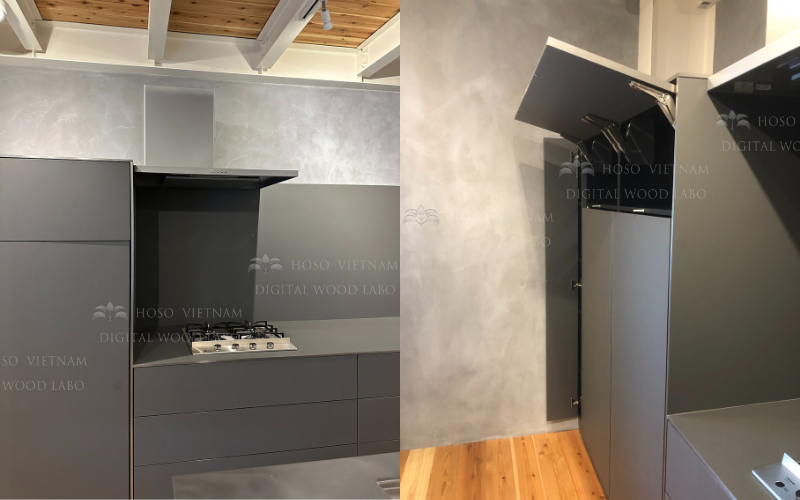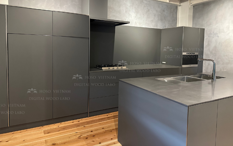 Căn bếp Graphite này sử dụng cốt gỗ MDF và ván dăm (PB) nhập khẩu từ Nhật Bản, được lựa chọn theo tiêu chuẩn ổn định kết cấu, đặc biệt phù hợp cho các hệ tủ phẳng, mảng lớn và kích thước cao kịch trần – những yếu tố đòi hỏi độ chính xác và độ bền cao theo thời gian.