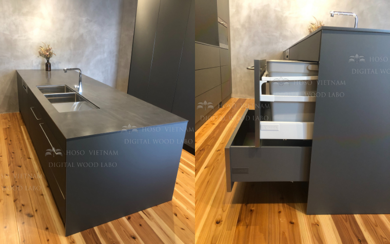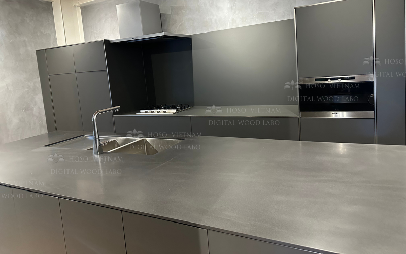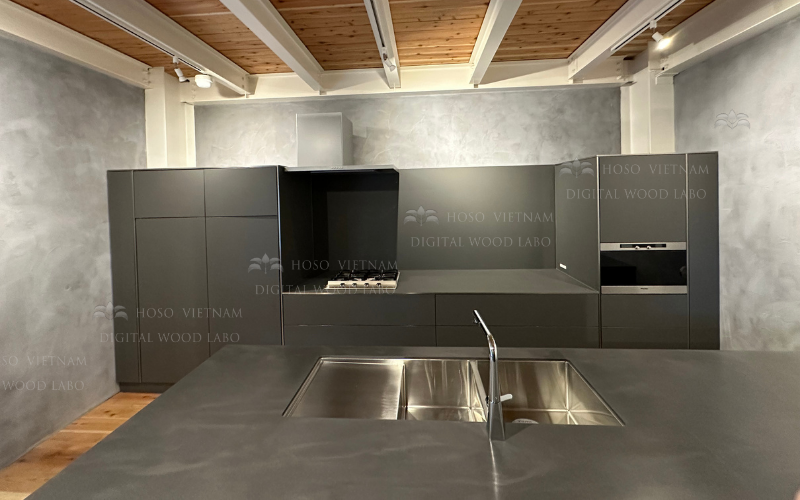 Không gian bếp tại Showroom Hoso Japan do Hoso Việt Nam thiết kế & thi công là một ví dụ điển hình cho xu hướng đó: tông graphite sang – mặt bàn hiệu ứng bê tông – đảo bếp lớn làm trung tâm trải nghiệm.