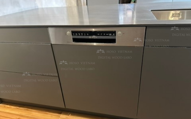 Máy rửa bát được lắp âm hoàn toàn trong khối đảo, đồng bộ màu sắc với hệ tủ xám chì: