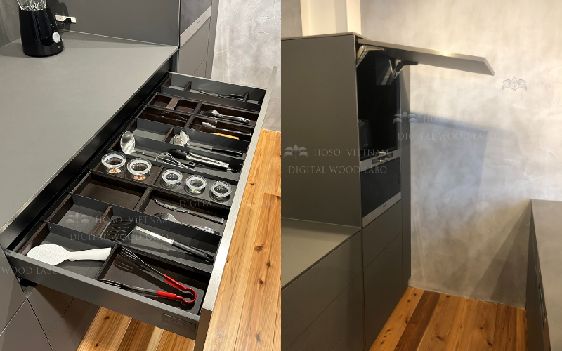 - Ngăn kéo chia khay cho dao, muỗng, dụng cụ nấu Hafele