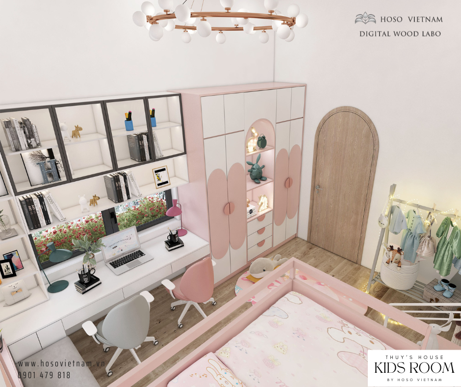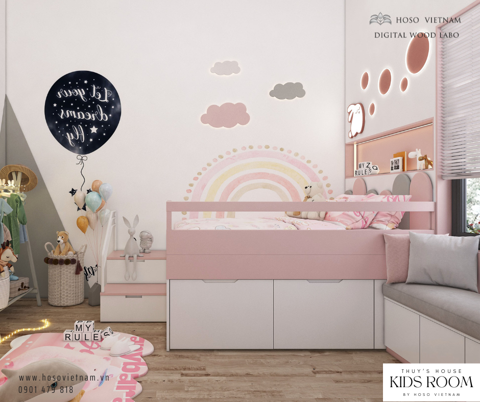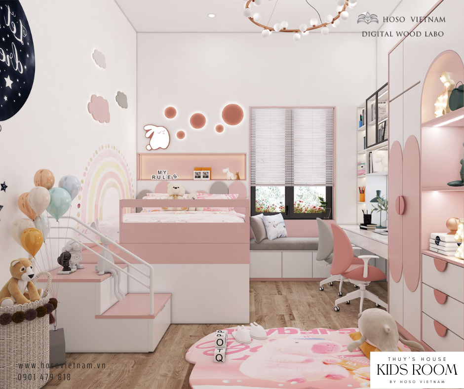 Với thiết kế này, không gian ngủ và sinh hoạt của trẻ được phân tách rõ ràng mà không làm căn phòng trở nên chật chội – một giải pháp đặc biệt phù hợp cho nhà phố và các không gian có diện tích vừa phải.