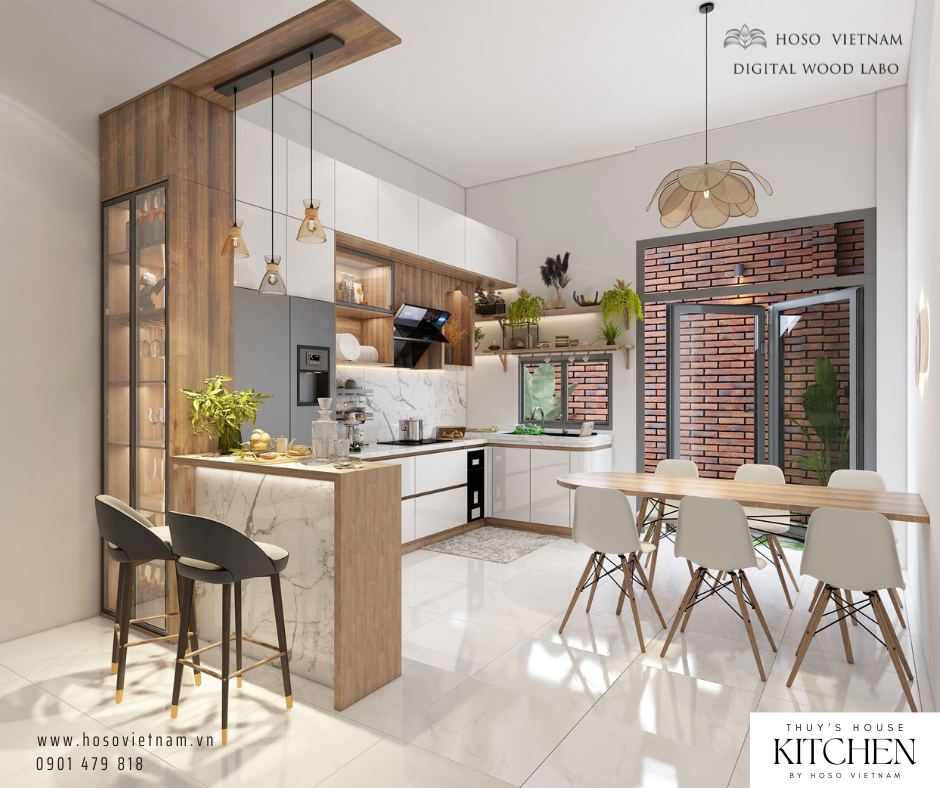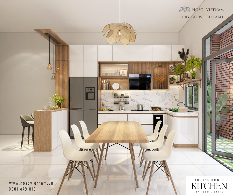 Ở Thuy’s House, bếp được đặt trong không gian mở, kết nối trực tiếp với bàn ăn và khu vườn nhỏ phía sau. Hệ tủ bếp chữ L kết hợp quần bar ngăn cách với khu vực phòng cách, tạo được sự riêng tư.