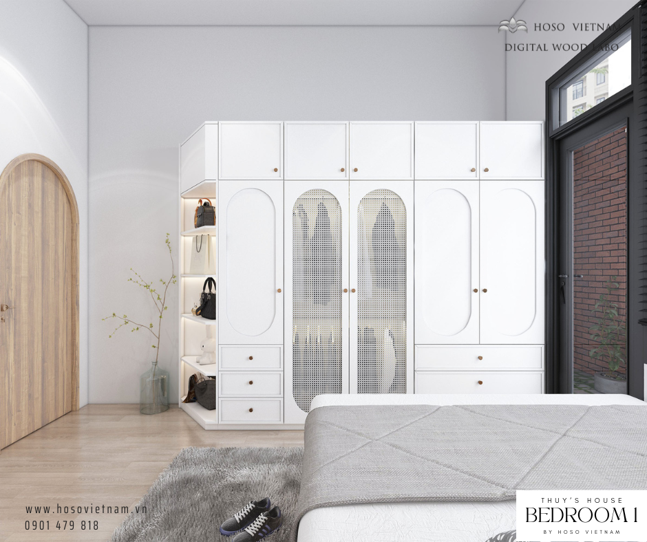 Hệ tủ quần áo được thiết kế cao kịch trần, chia khoang hợp lý. Cánh tủ trắng phẳng kết hợp chi tiết bo cong mềm mại. Một số cánh sử dụng vật liệu đan trang trí, tạo điểm nhấn thị giác. Kết hợp kệ mở trưng bày túi xách, phụ kiện. Không chỉ là nơi cất đồ, tủ quần áo còn trở thành một phần của thiết kế nội thất tổng thể.